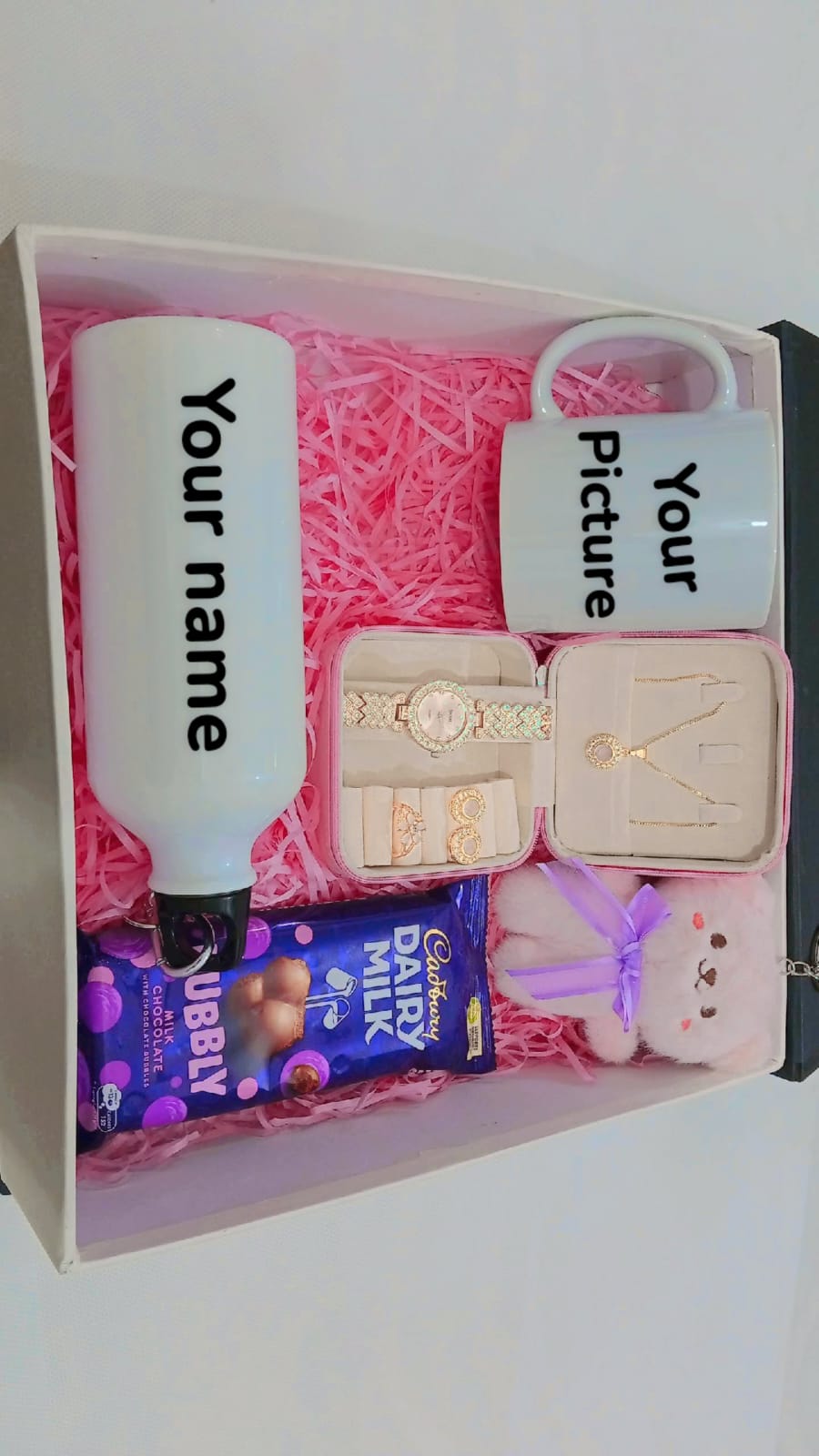 Elevate your gifting with this thoughtfully curated gift box designed for the special women in your life. This premium collection combines elegance and sentiment, featuring a stunning jewelry set that adds sophistication to any ensemble, paired with a charming teddy bear for warmth and comfort. Personalize your gift further with custom engraving on both the mug and bottle, creating meaningful keepsakes she'll treasure daily. Completed with indulgent large chocolate, this comprehensive gift set delivers luxury, personalization, and heartfelt sentiment in one beautifully presented package.